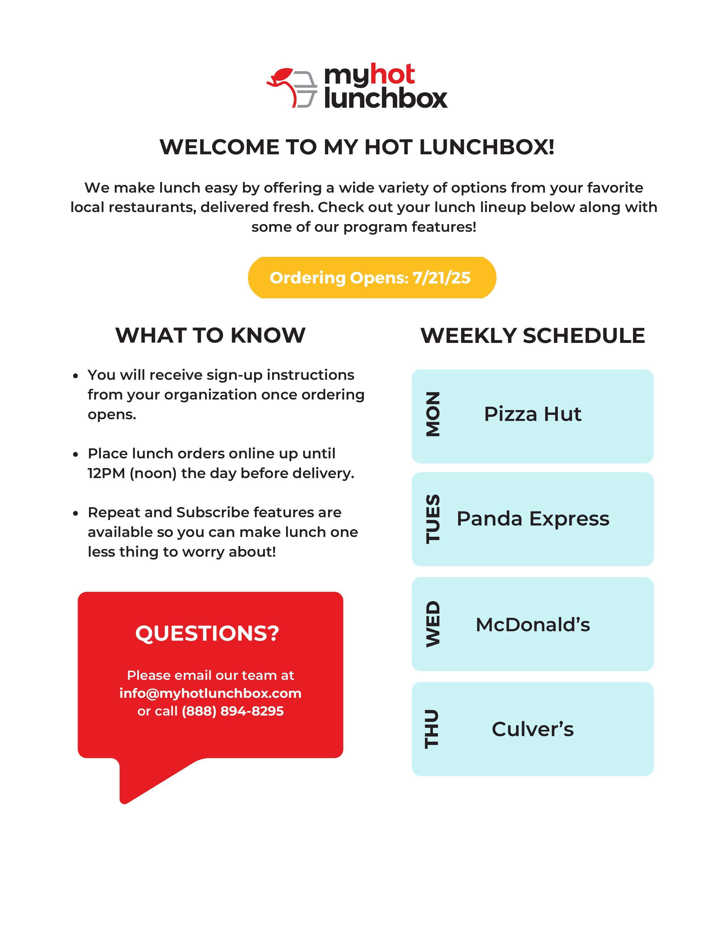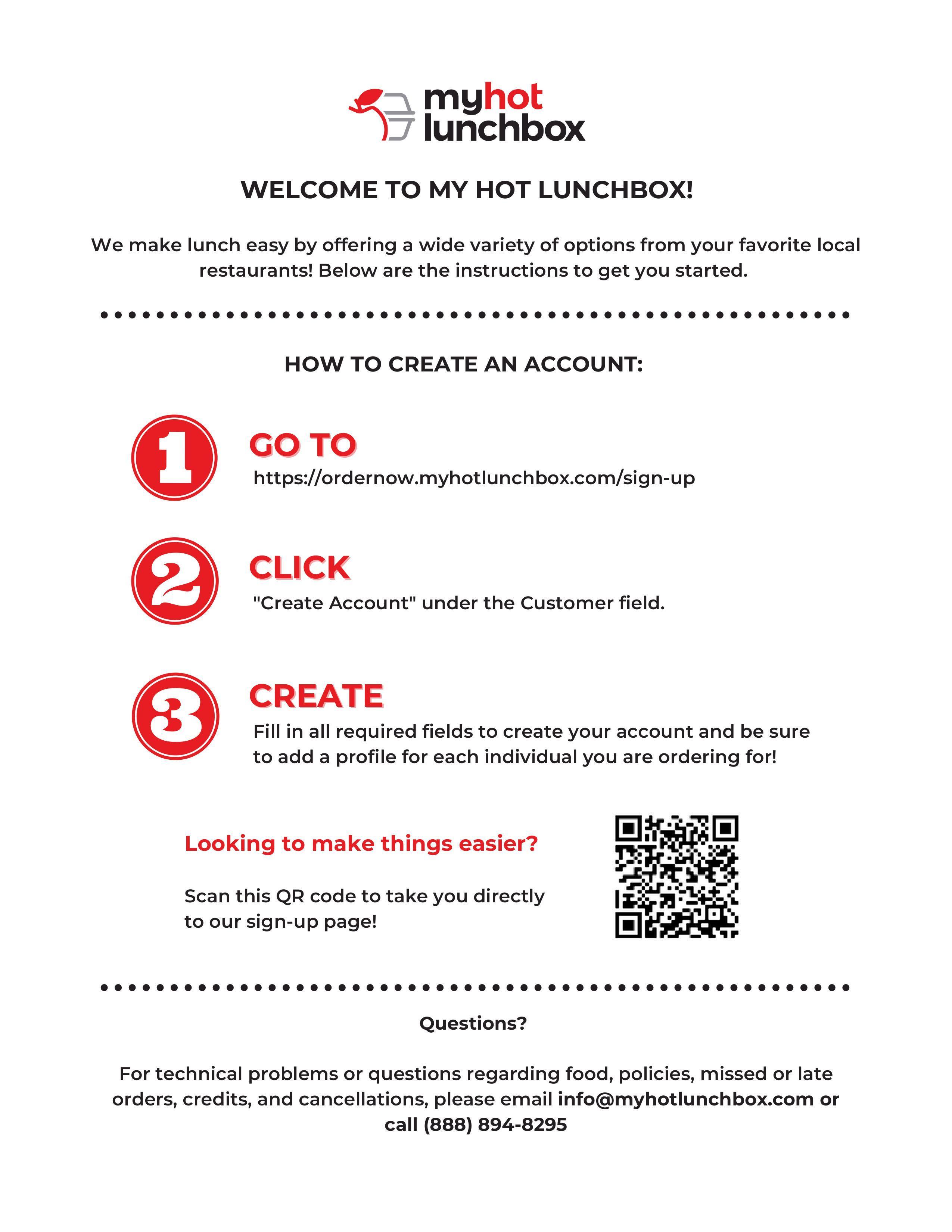 If you have any questions with registration or lunch concerns, please contact My Hot Lunchbox at (888) 894-8295 or email: [email protected]